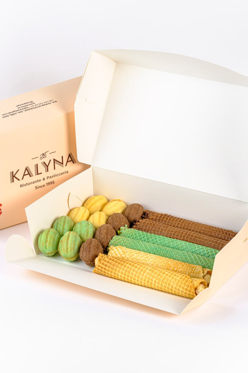 Набір складається з хрустких шоколадних вафельних трубочок з шоколадним кремом зі згущеним вареним молоком,хрустких вафельних трубочок з фісташковим кремом та хрустких вафельних трубочок з вареним згущеним молоком,з пісочних шоколадних горішків з шоколадним ганашем, пісочних горішків з фісташковим ганашем,пісочних горішків з вареним згущеним молоком