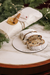 Традиційний різдвяний пиріг, в основі якого дріжджове тісто, насичене добірними сухофруктами, цукатами та горіхами, попередньо вимоченими в ромі для глибшого смаку й аромату. У центрі — класичний шар марципану, що надає штолену характерну соковитість та м’якість.
