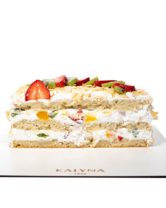 Веганский бисквит на безглютеновой муке, приготовленный без яиц, на основе фруктового сока, с прослойкой безлактозных сливок, с кусочками фруктов: свежая клубника, персик, киви.