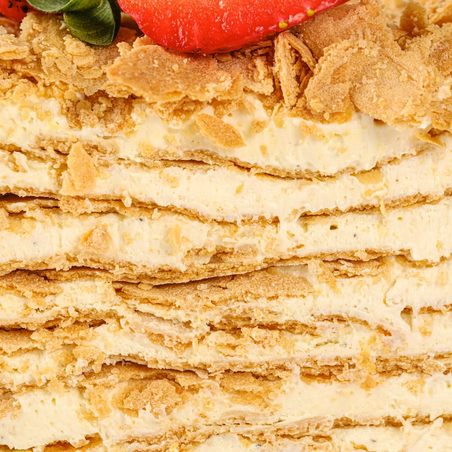 Хрусткі коржі, виготовлені на безлактозному маслі та безглютеновому борошні з ніжним вершковим безлактозним кремом на основі натурального цукрозамінника еритритол. Прикрашений ягодами.