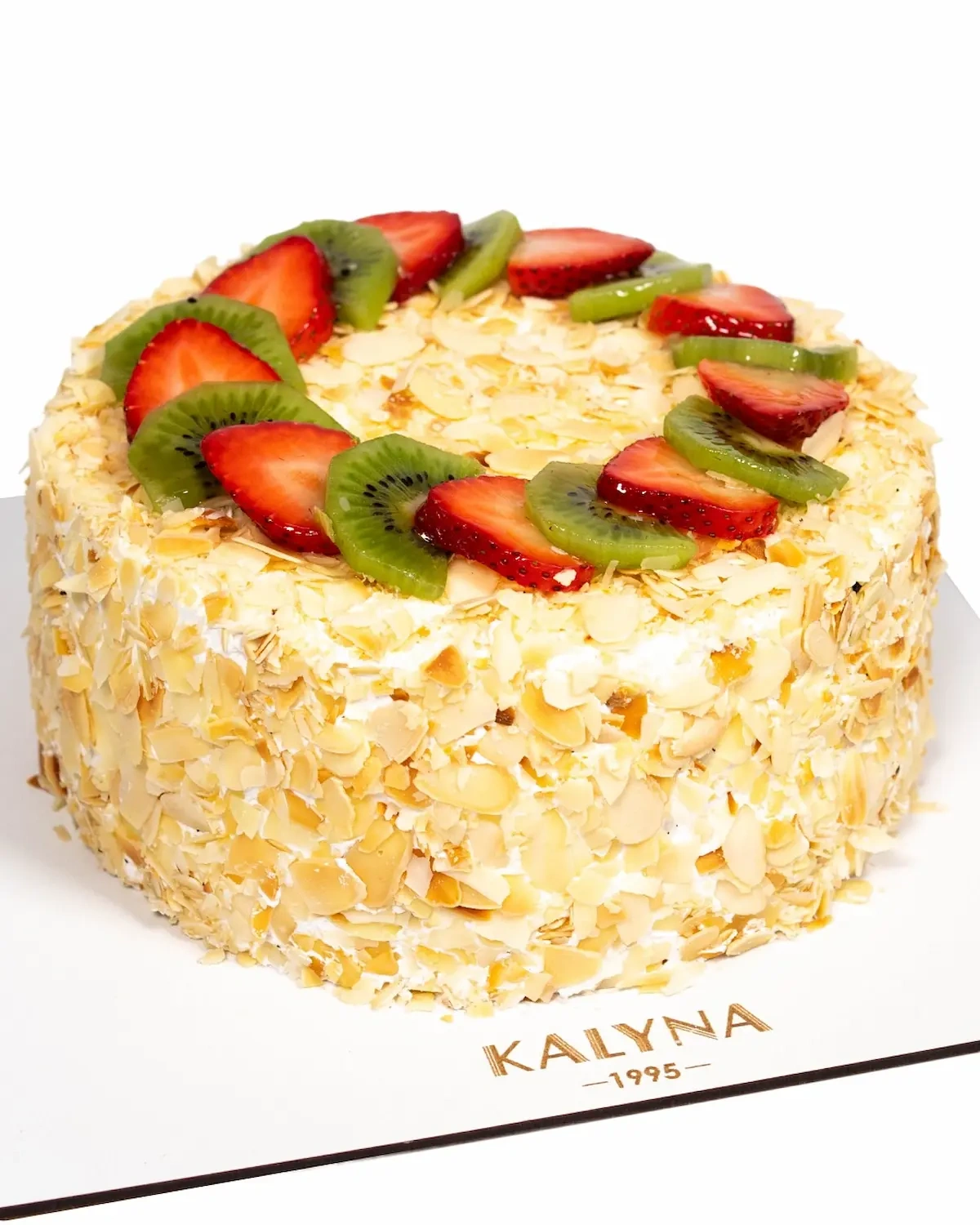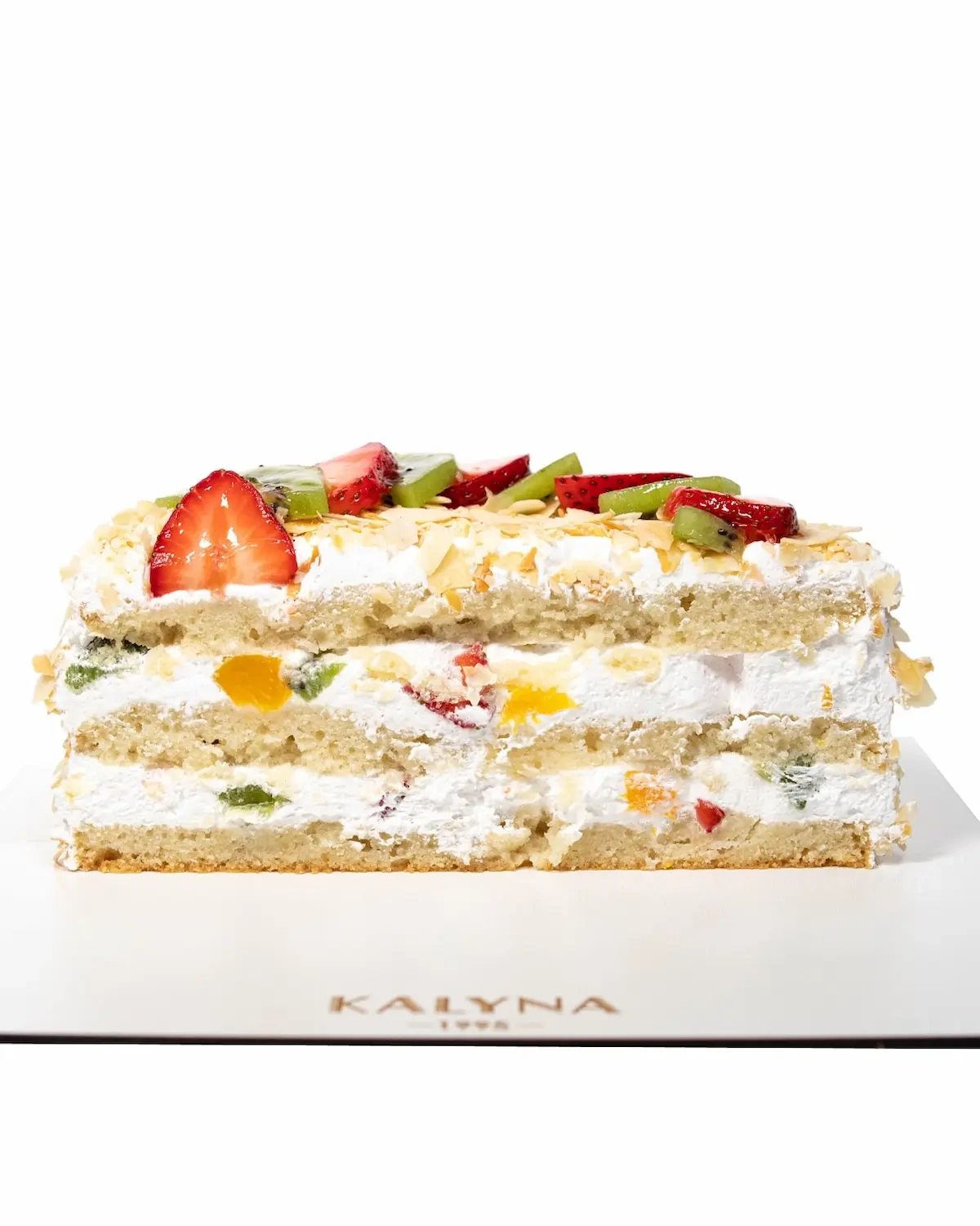 Веганський бісквіт на безглютеновому борошні, приготовлений без яєць, на основі фруктового соку, з прошарком безлактозних вершків, зі шматочками фруктів: свіжа полуниця, персик, ківі.