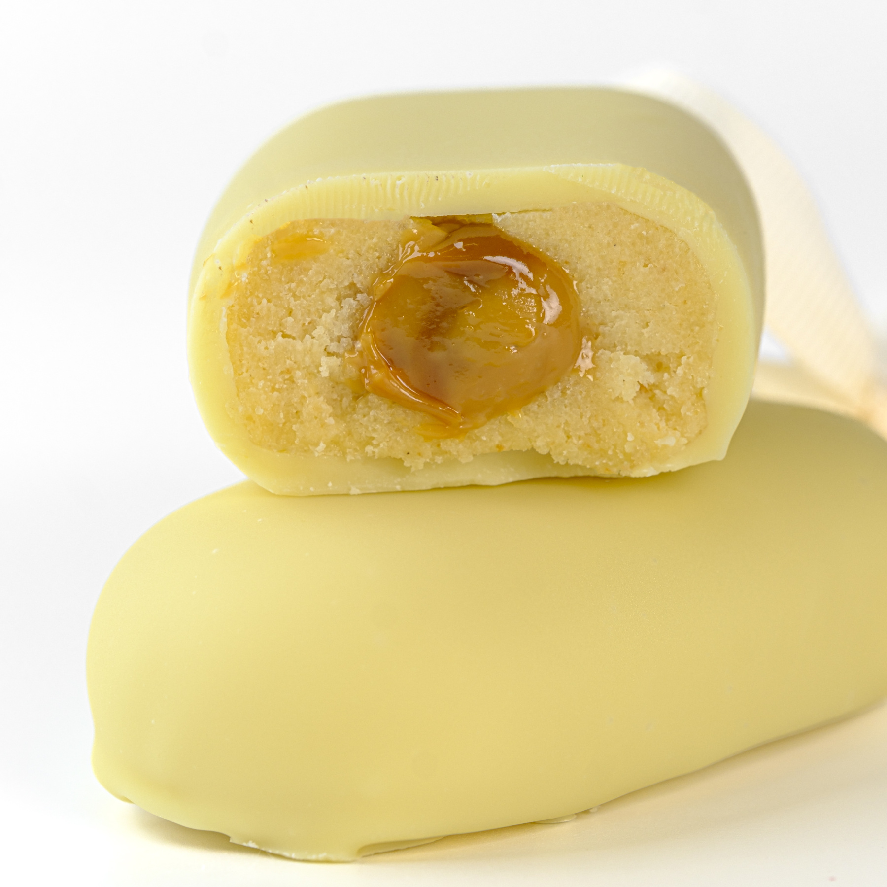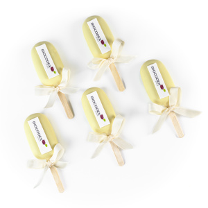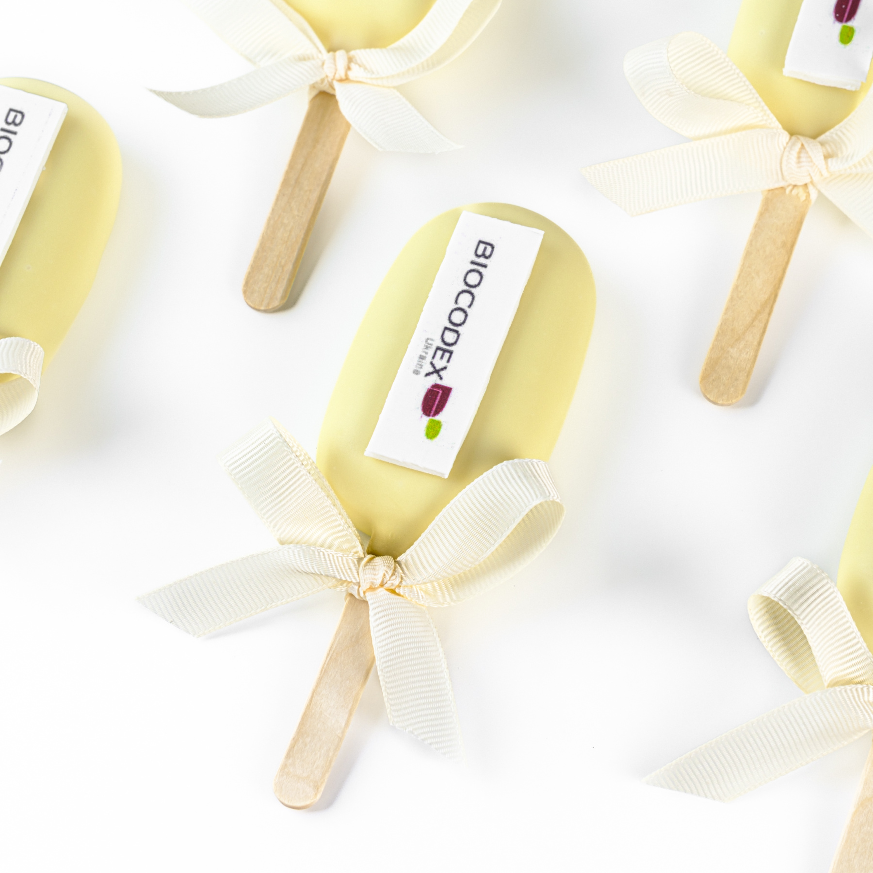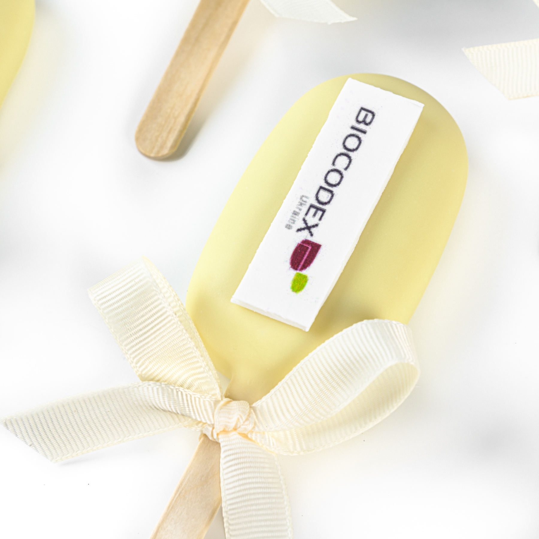Ескімо — це поєднання бісквітної основи з кремом та з начинкою з вареного згущеного молока, вкритого білим шоколадом, прикрашений вашим логотипом.