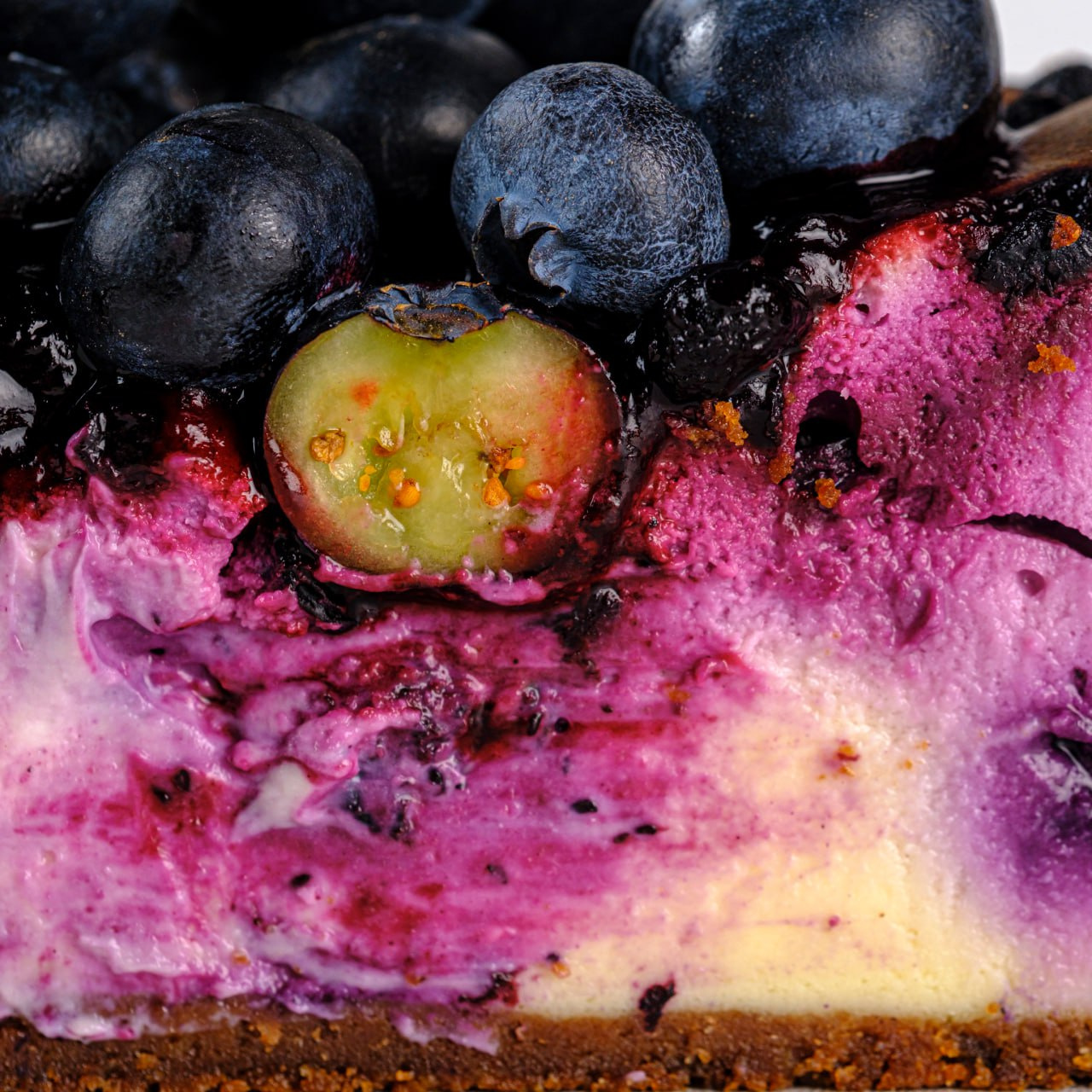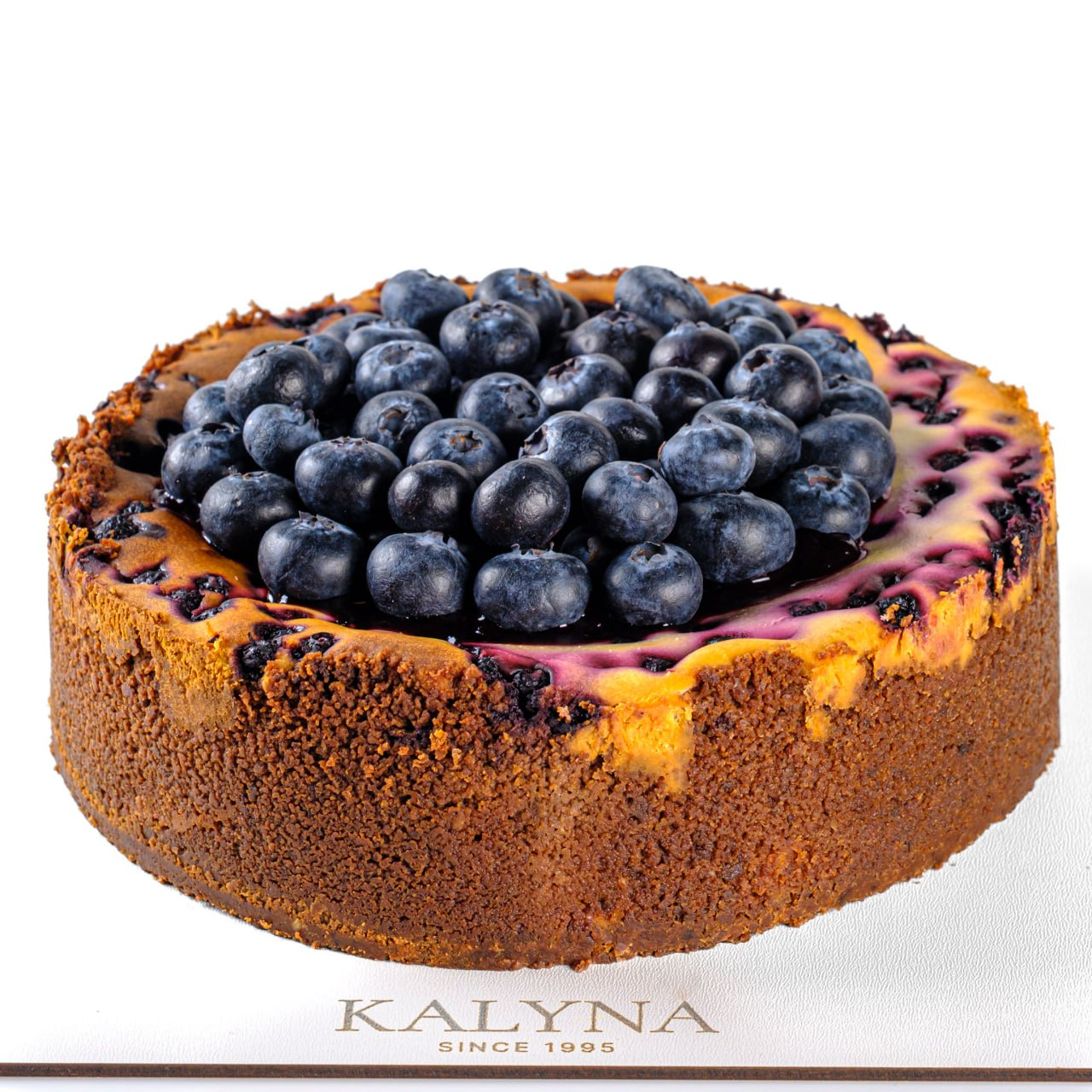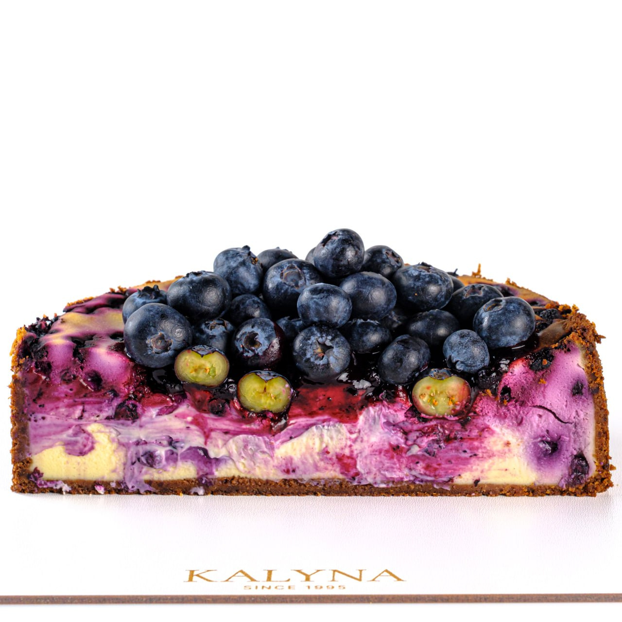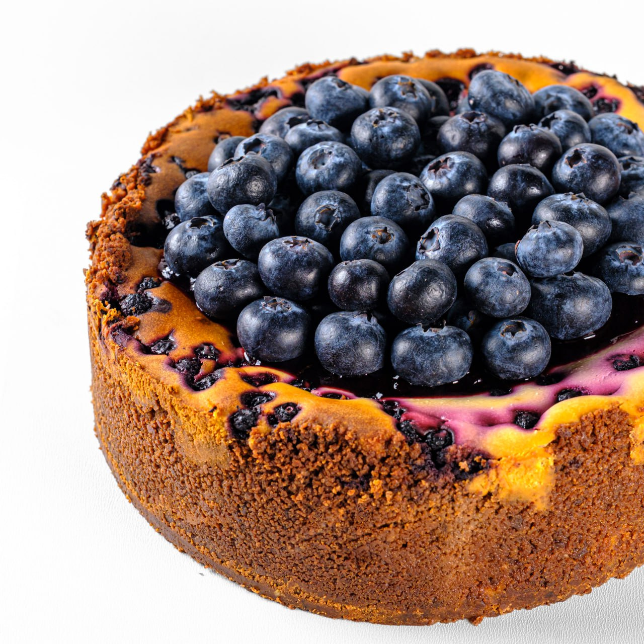 Основа чизкейка – цукрове сабле. Всередині – ніжна сирна начинка на основі сиру Хохланд з ягодами чорниці. Оздоблений соусом з чорниці та ягодами лохини