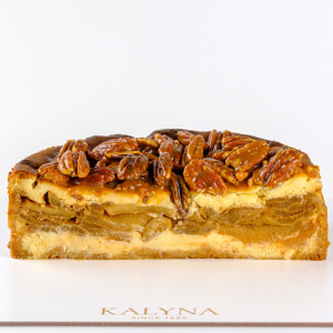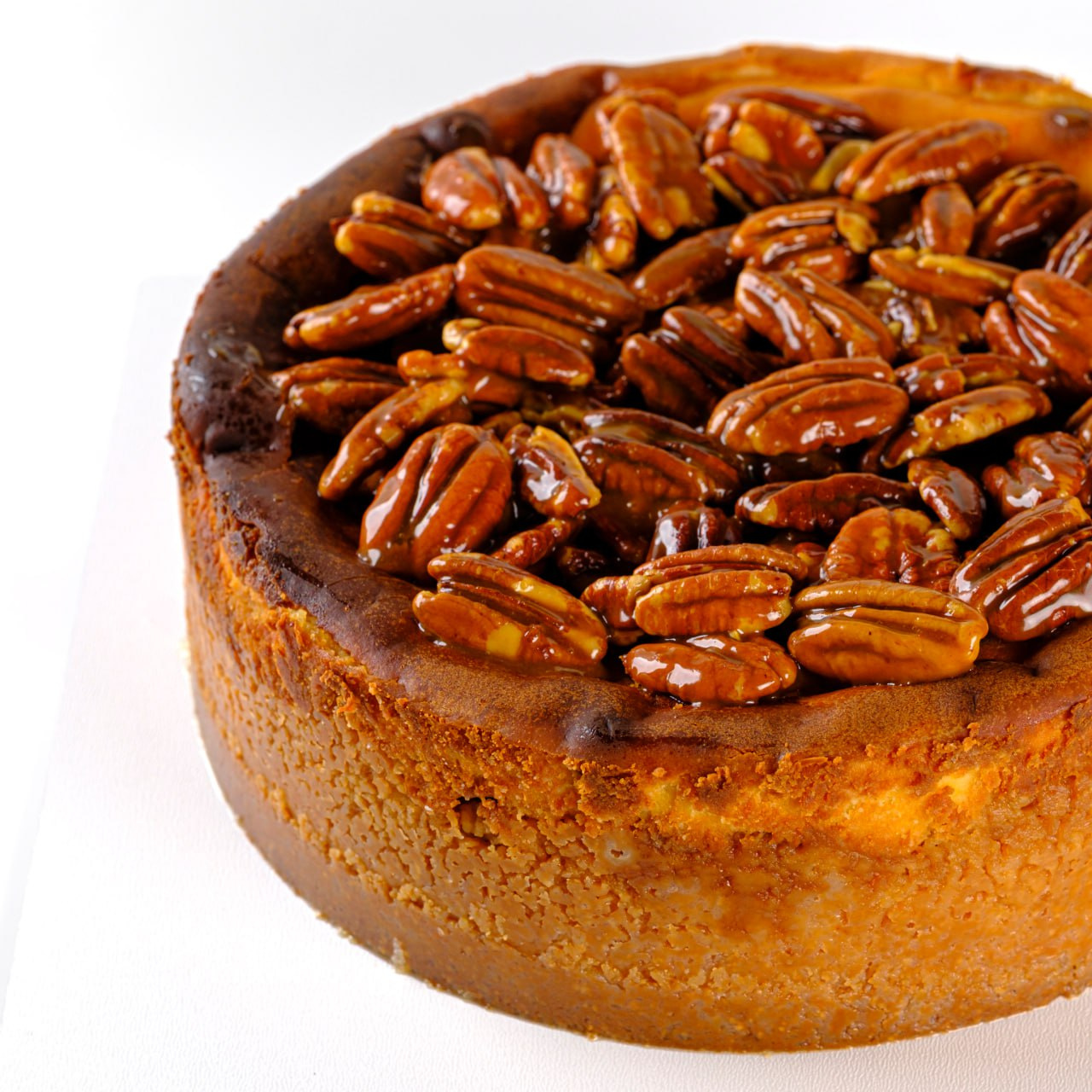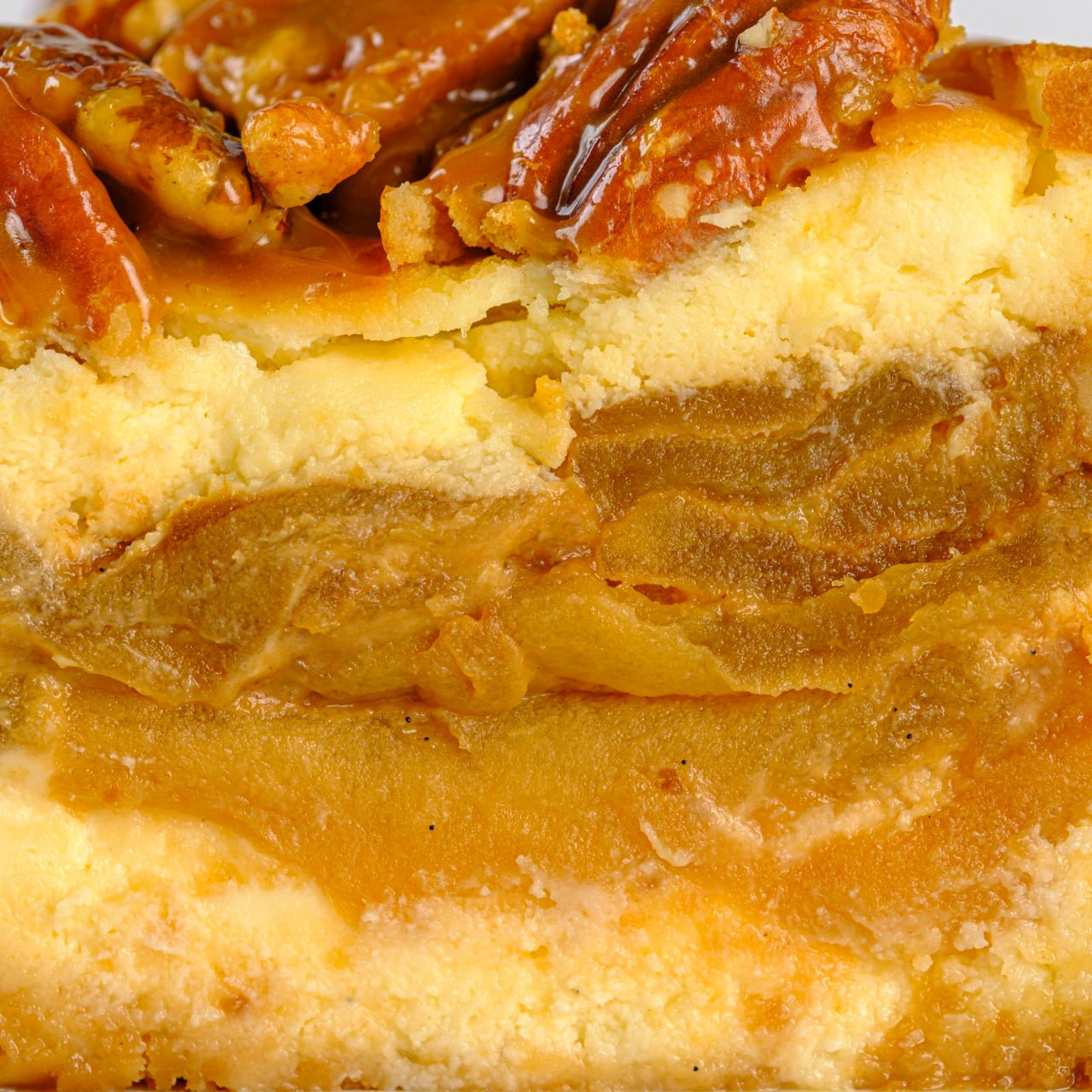 Основа чізкейка на вівсяних пластівцях. Всередині – ніжна сирна начинка на основі сиру Хохланд з яблучною начинкою в карамелі. Оздоблений м'якою карамеллю та горіхами пекан
