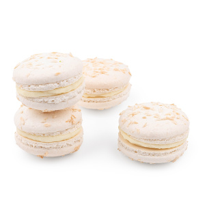 Детальніше: Борошно мигдальне,цукрова пудра , яєчний білок, цукор,білий шоколад Callebaut,вершки рослинні,тримолін,цукор, кокосова паста, кокосові пластівці
