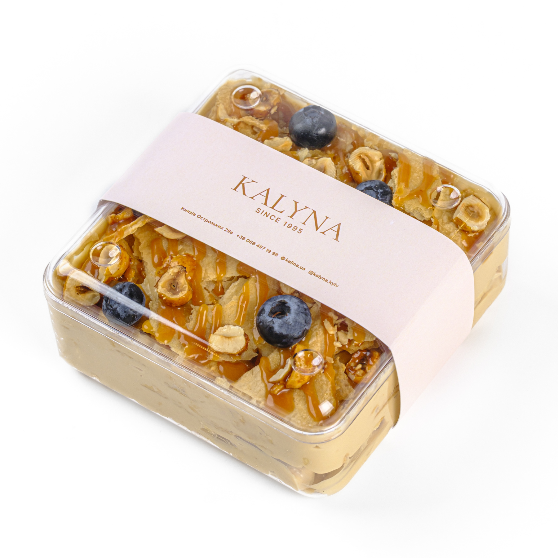 Хрусткі тонкі коржі з ніжним карамельним кремом. Прикрашений свіжою лохинею та солоною карамеллю.