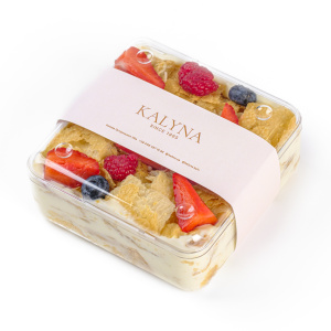 Хрусткі тонкі коржі з ніжним вершковим кремом. Прикрашений свіжими ягодами.