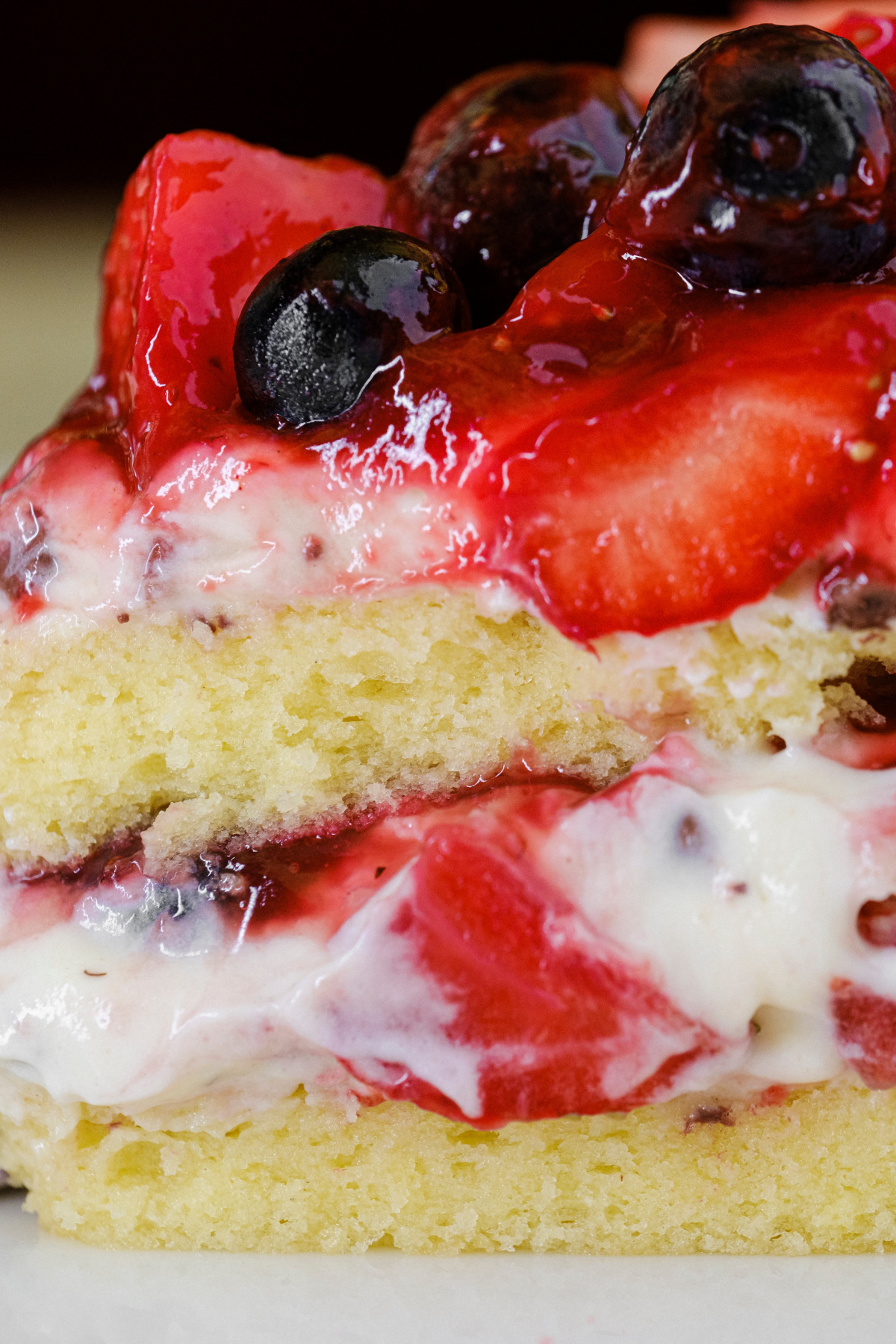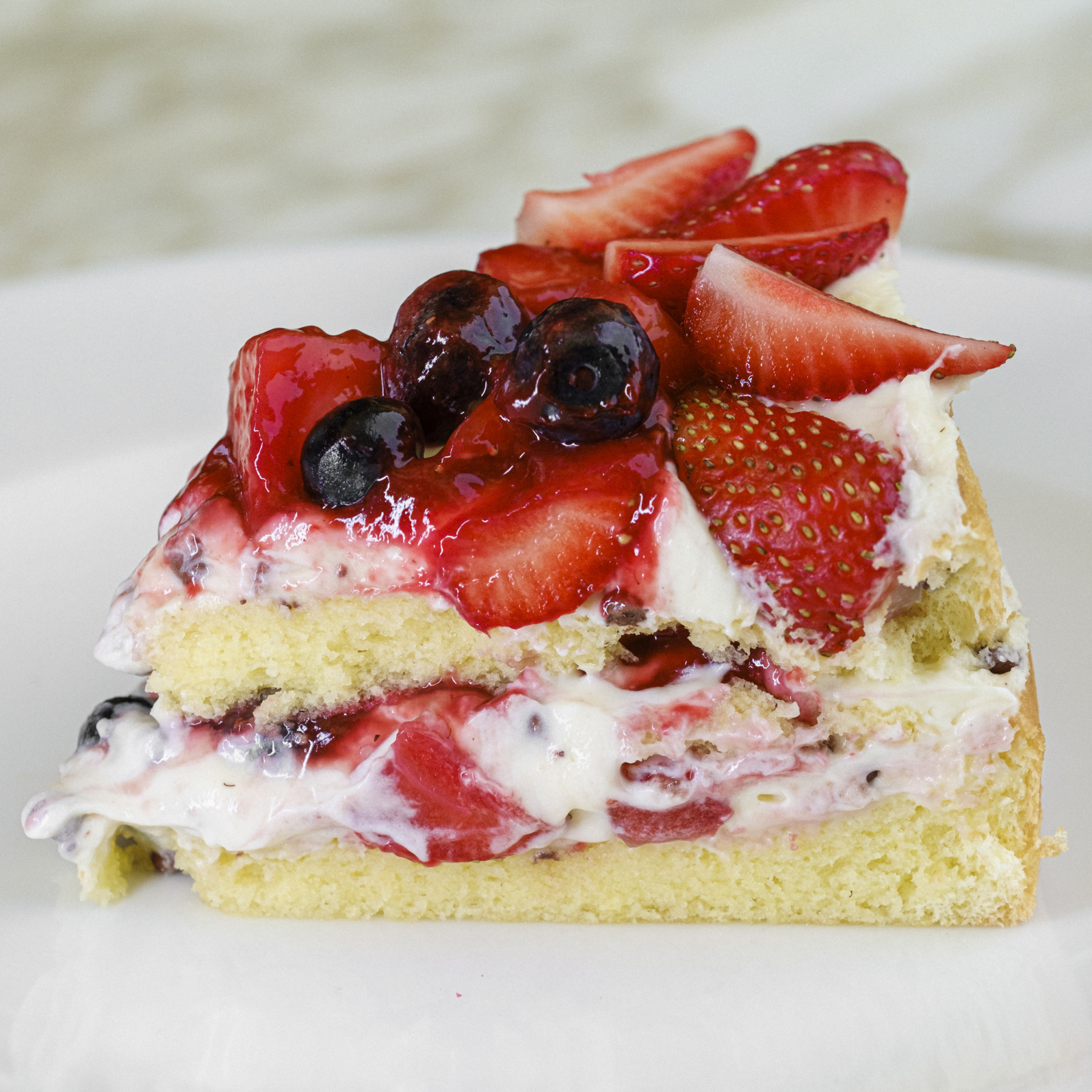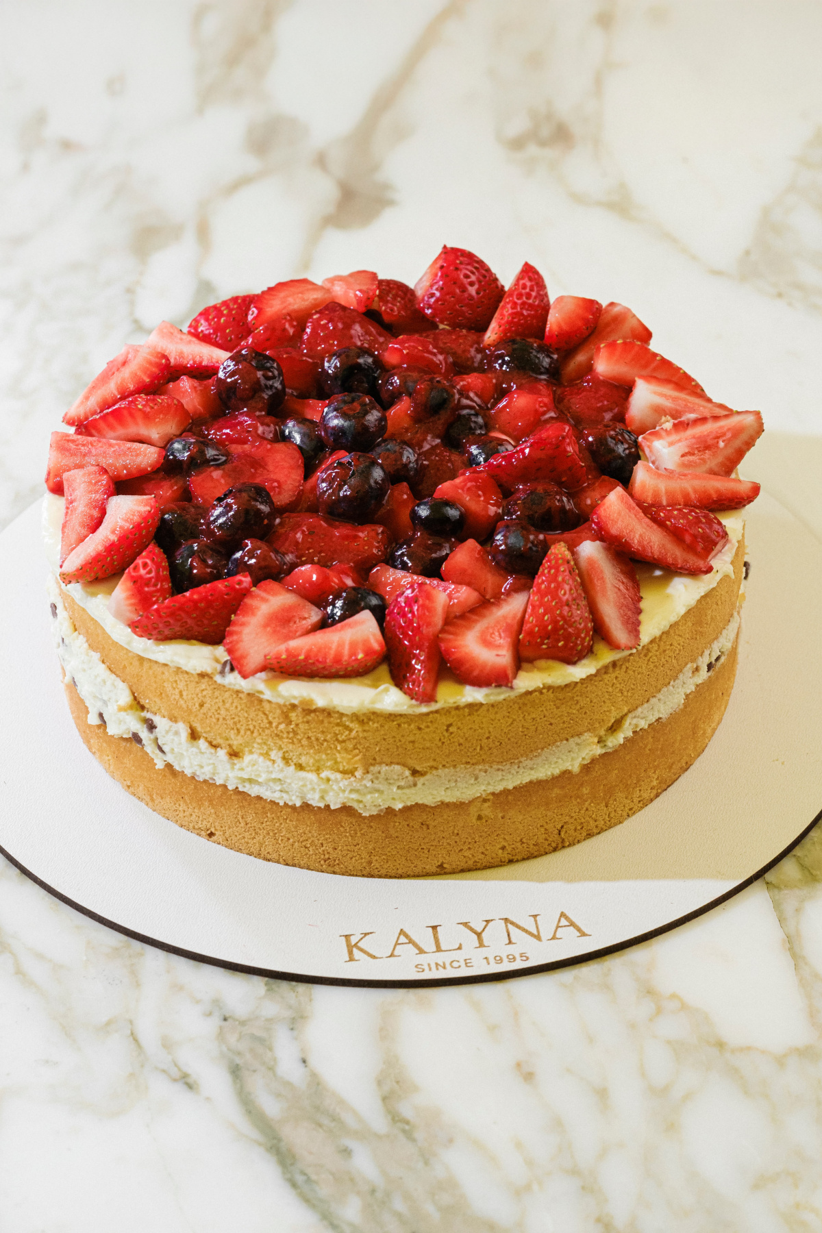 Легкий бісквіт, просочений сиропом з прошарком із вершково-заварного крему, ягодами, шоколадними дропсами та малинового кулі. Прикрашений міксом ягід.