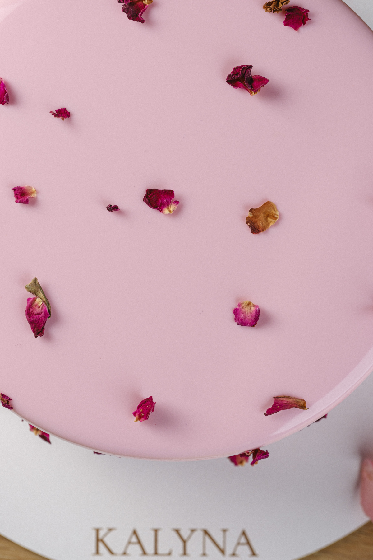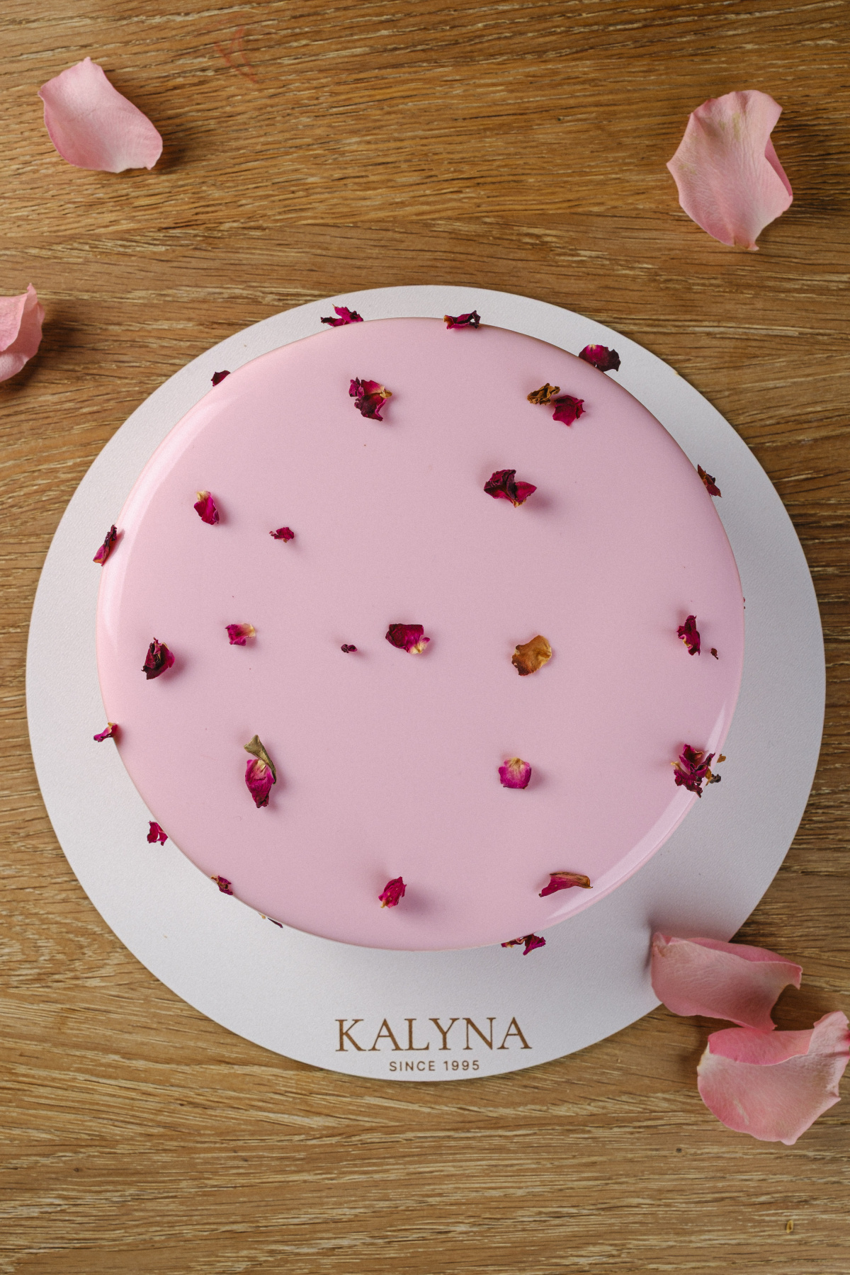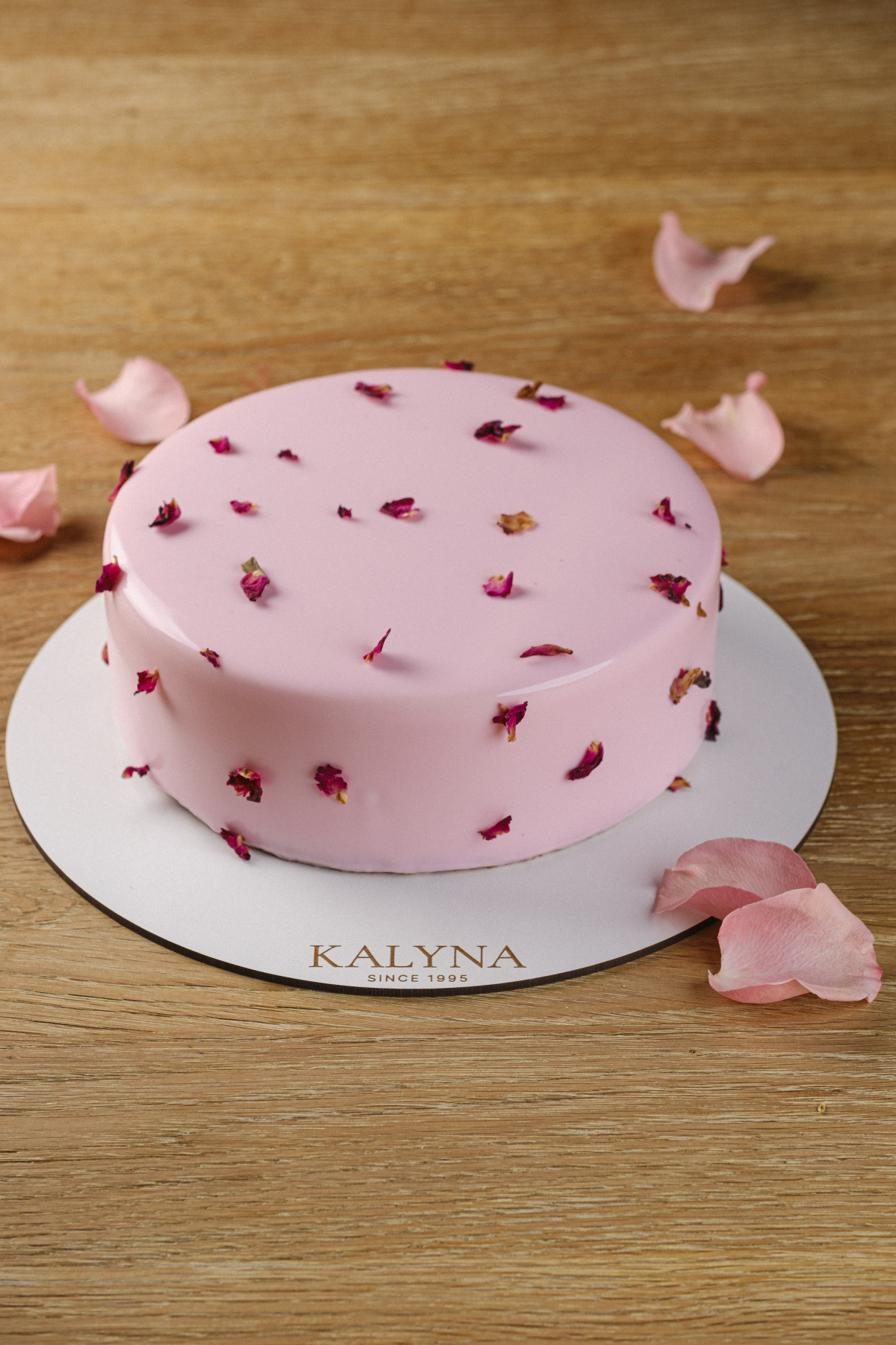 Миндальный бисквит, клубничный мусс, клубничное желе, ванильный мусс на белом шоколаде. Покрыт розовой глазурью и украшен лепестками роз.