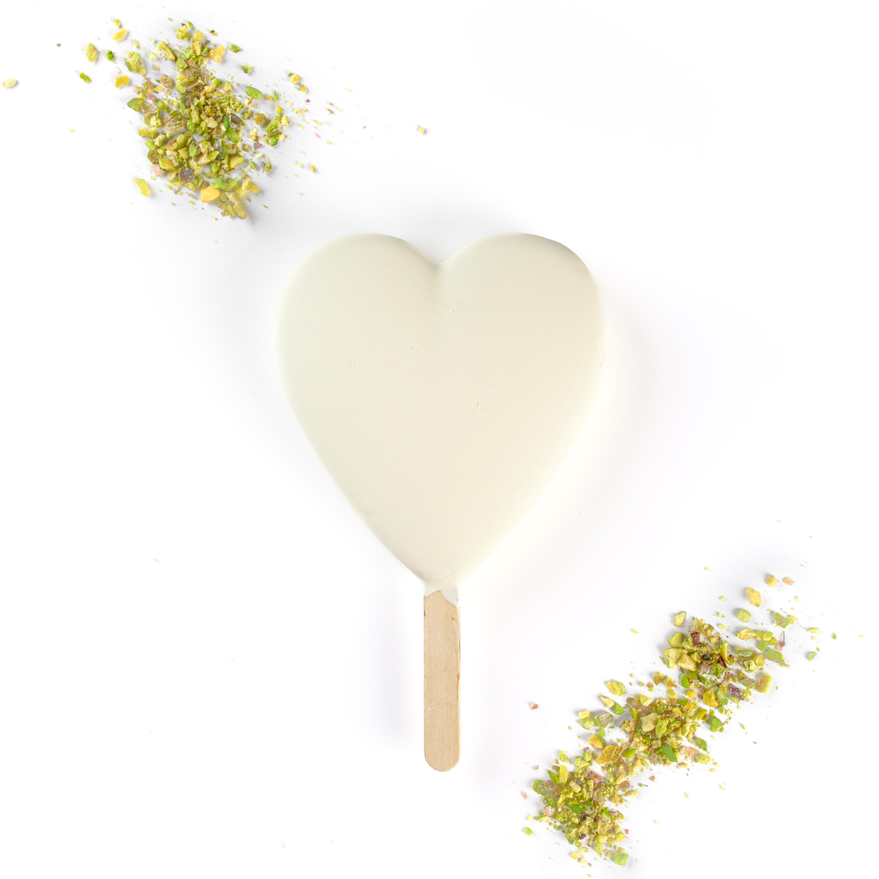 Фисташковое мороженое на палочке в белом шоколаде в форме сердца. Фирменное натуральное мороженое. Бельгийский шоколад Callebaut.