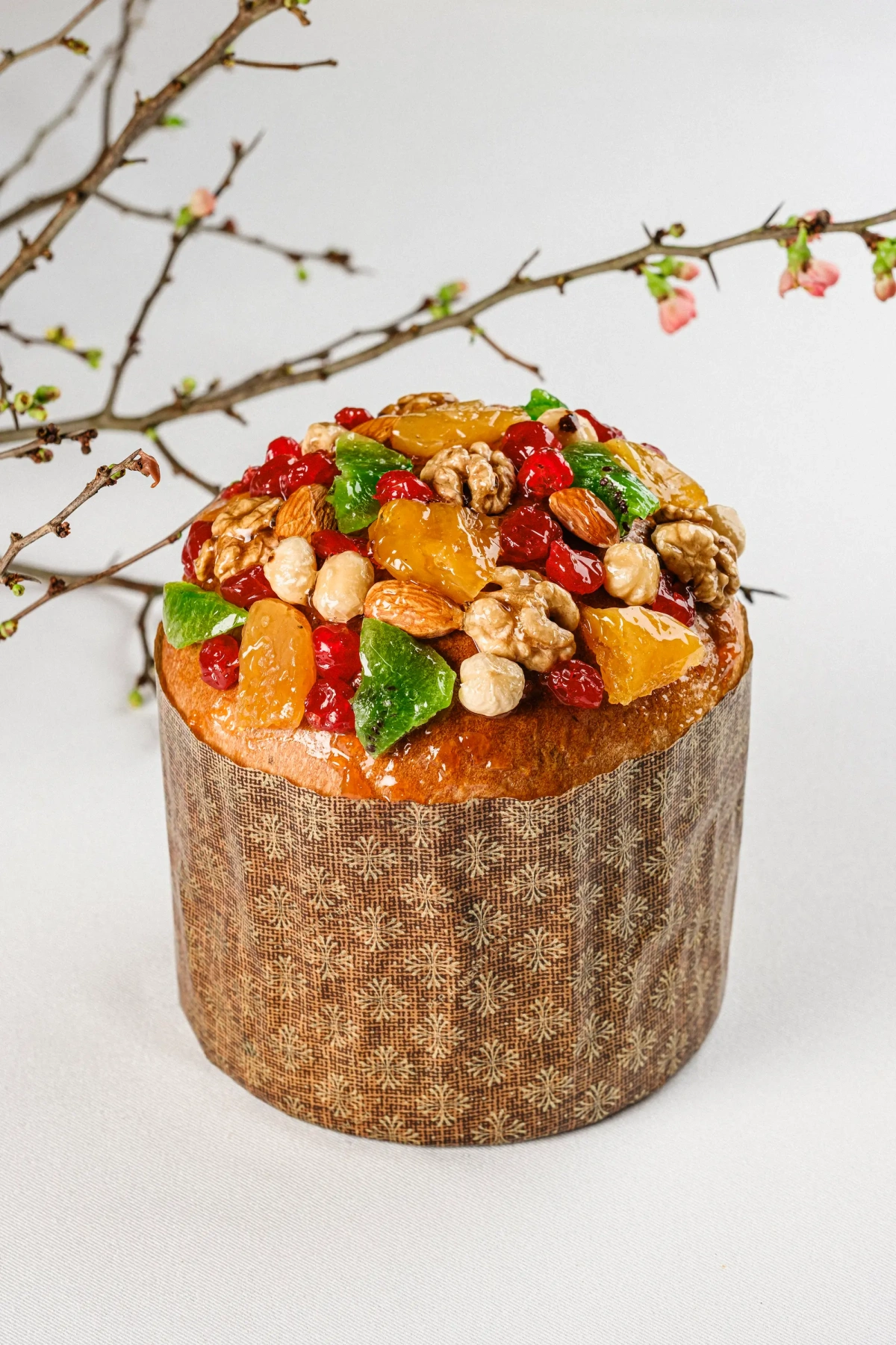 Детальніше: Борошно пшеничне, вершкове масло 82%, яйця, молоко, рослинне масло, дріжджі, цукор, сіль, ванілін, родзинки або цукати, фундук,горіх волоський,ківі сушене,курага,мигдаль,вишня сушена, гель для декору.