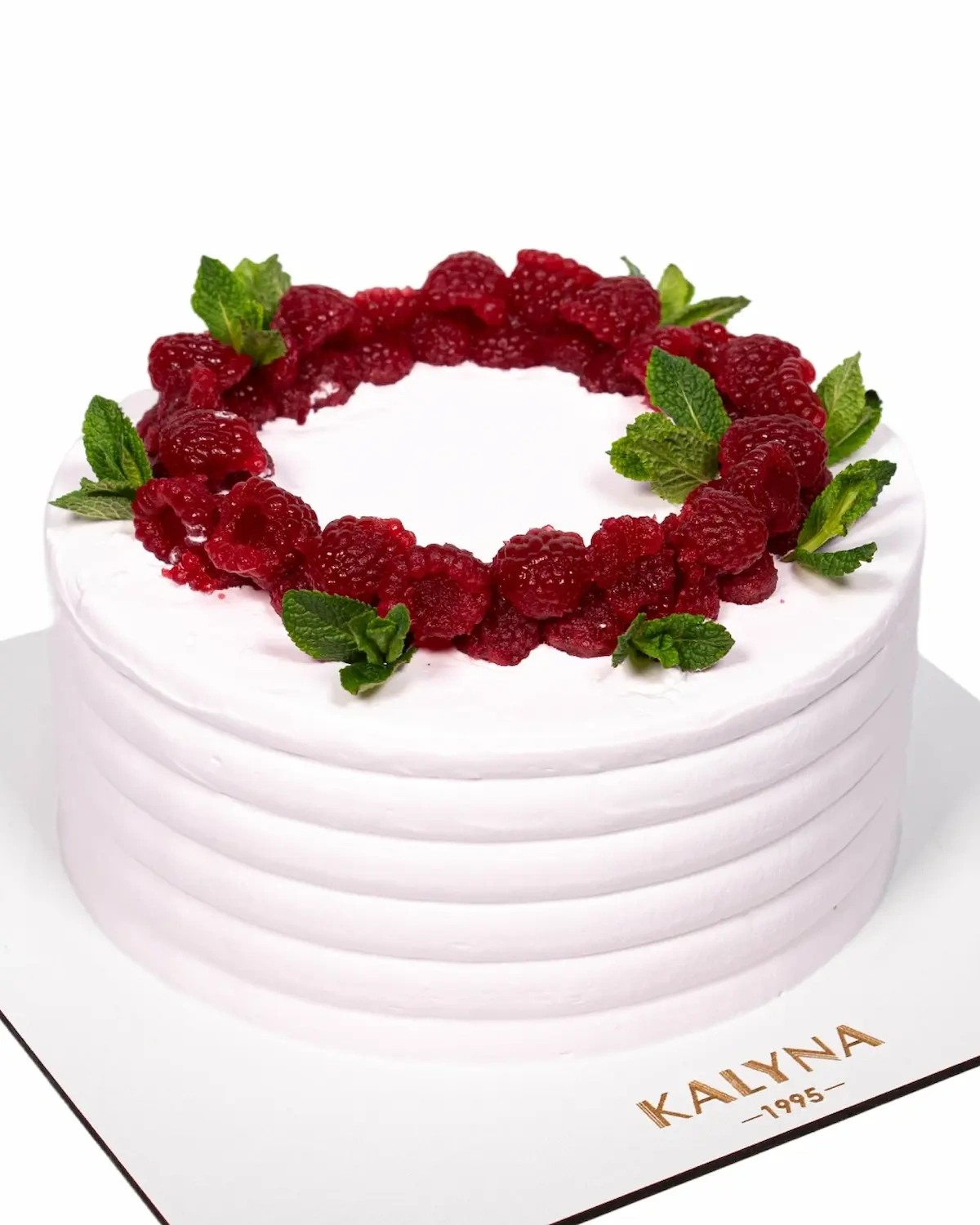 Пропитанный малиновым конфи, с прослойкой безлактозного сливочно-малинового крема с ягодами малины. Покрыт растительными сливками. Украшен малиново-желейным декором в виде короны из ягод малины.