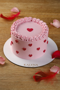 В основе - шоколадный бисквит, пропитанный ежевичным джемом с прослойками сливочного крема на основе маскарпоне, нежного ежевичного мусса и ежевичным желе. Покрыт кремом чизом, украшен шоколадными сердечками.