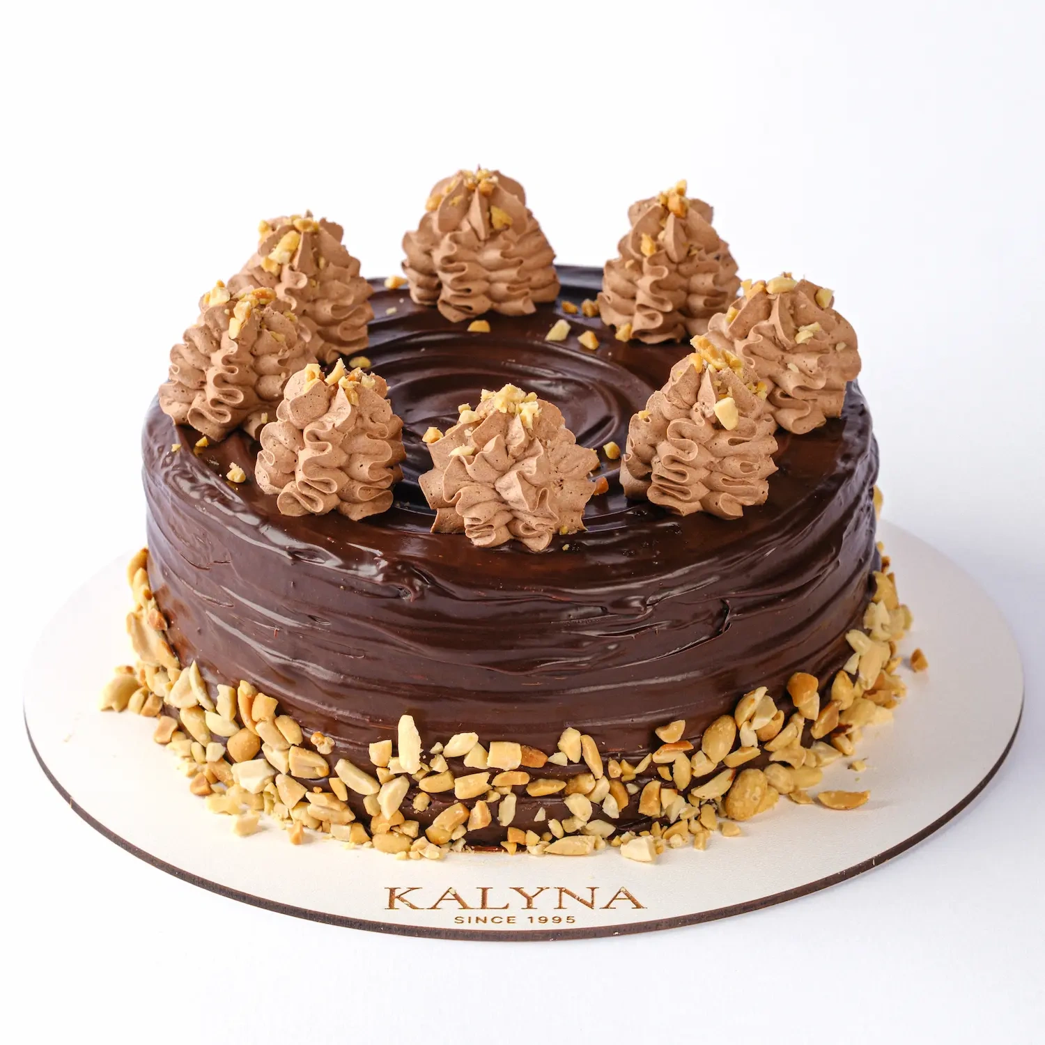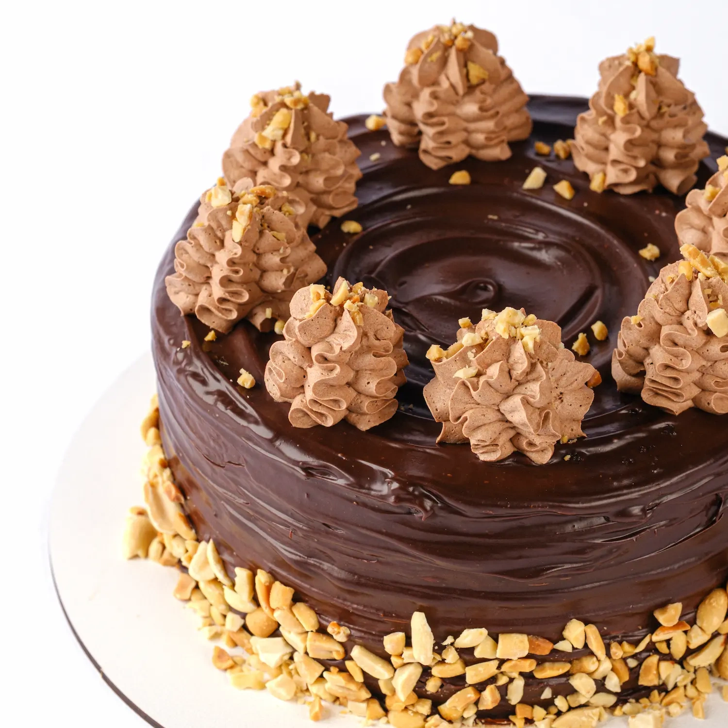 Шоколадно-масляный безглютеновый бисквит, с прослойками творожным-заварным безлактозным кремом, шоколадным ганашем, соленой карамелью на основе эритрита с добавлением жареного соленого арахиса.