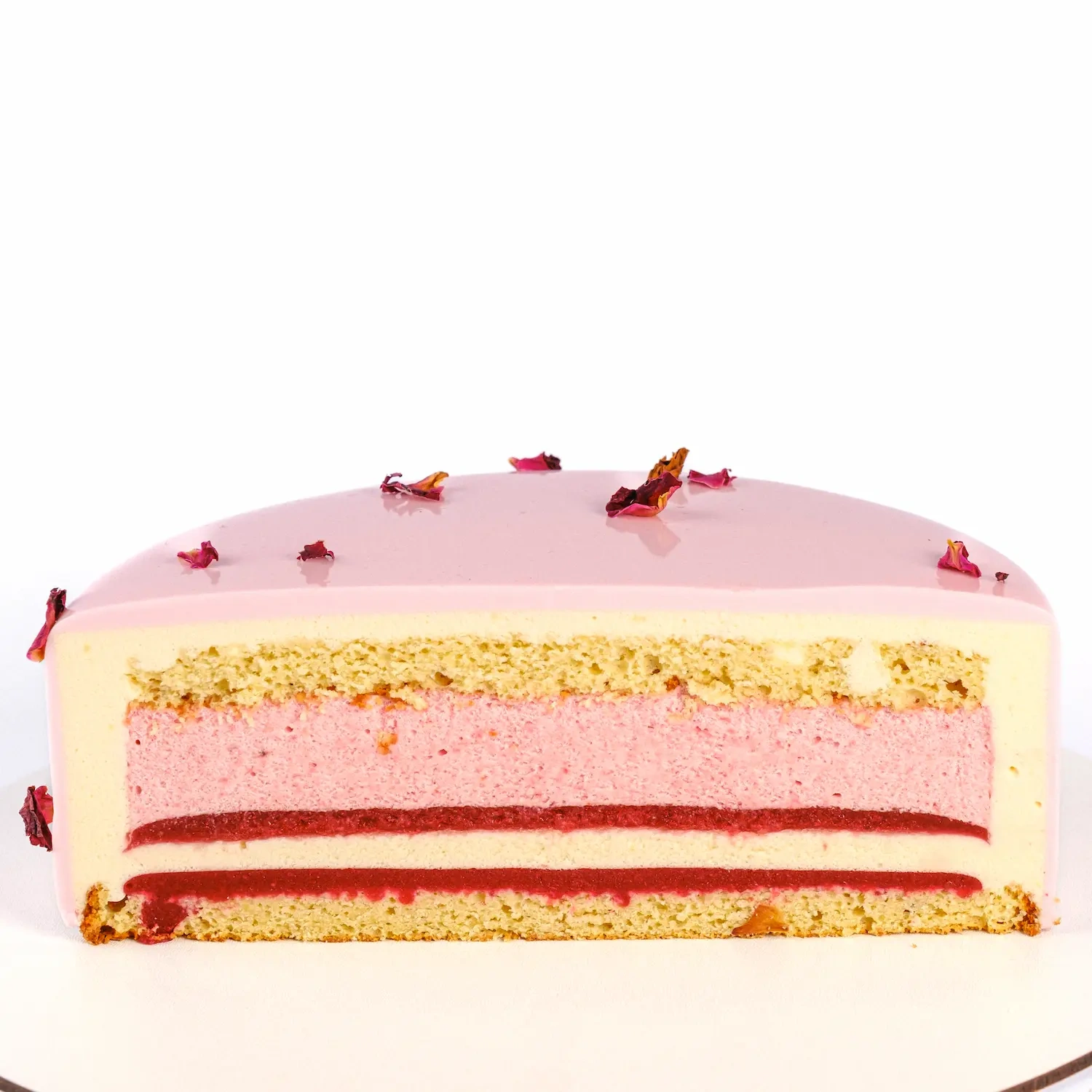 Ванильно-клубничный муссовый торт. Миндальный бисквит, клубничный мусс, клубничное желе, ванильный мусс на белом шоколаде.