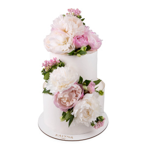 Весільний торт під крем-чізом із живими квітами.