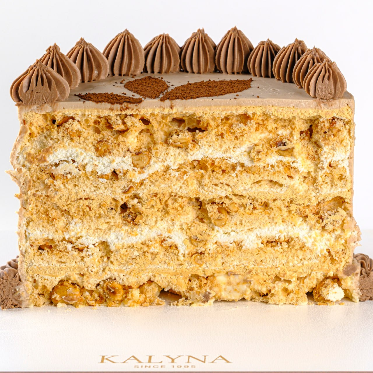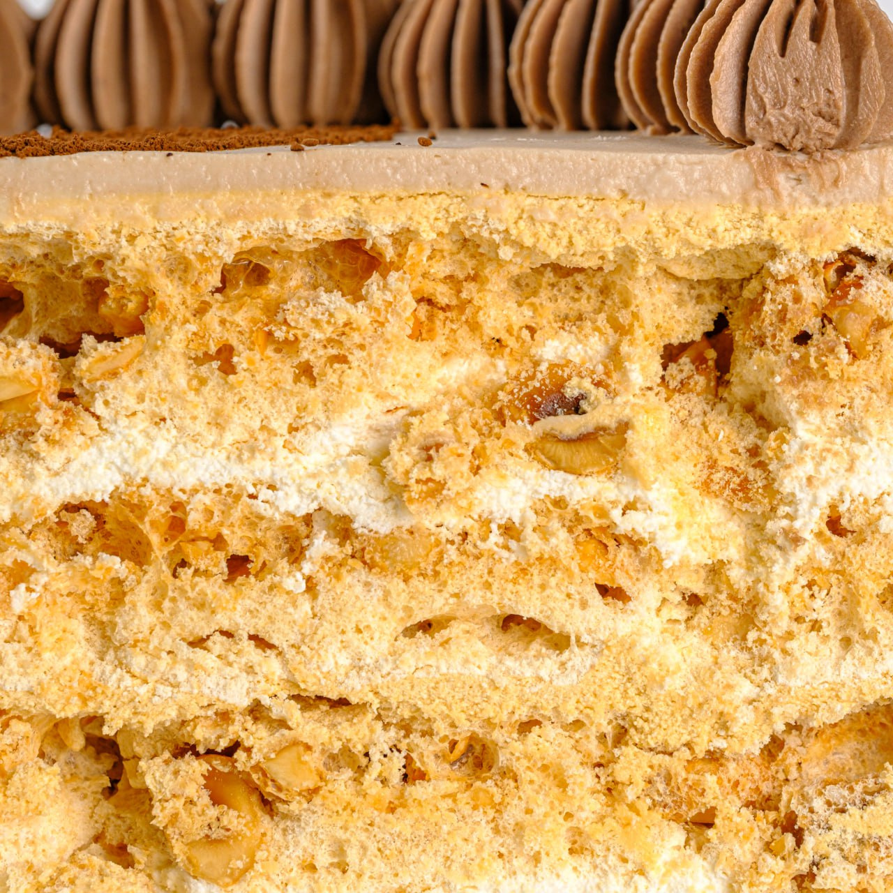 Ніжні хрусткі коржі-безе з додаванням смаженого подрібленого горіху фундук з двома прошарками крему, білково-масляний заварний крем та масляний крем на сгущеному молоці. Вкритий крем чізом, прикрашений какао у вигляді каштанового листа
