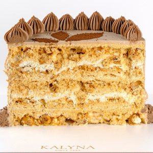 Детальніше: Білок яєчний,цукор, борошно пшеничне,фундук смажений,масло вершкове 82%, молоко сгущене,лимонна кислота, крем сир,цукрова пудра, какао