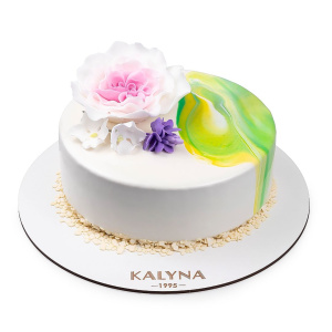 Торт під яскравою глазур’ю із квітами ручної роботи з цукрової пасти.