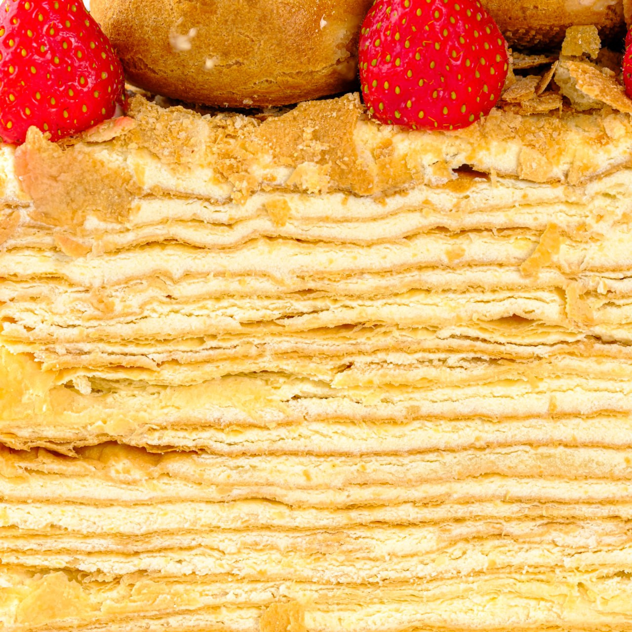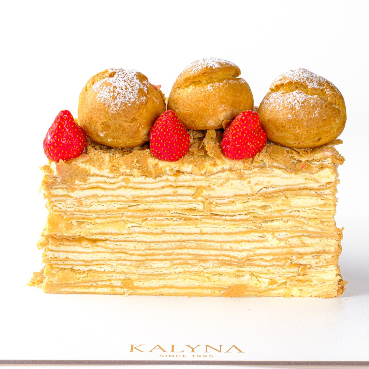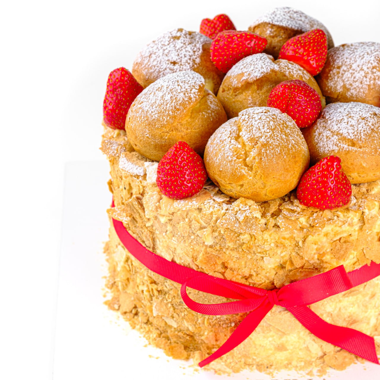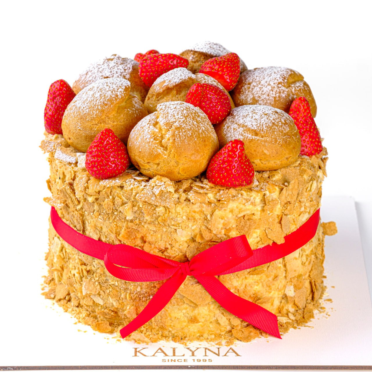Торт з листкового тіста з прошарками масляно-заварного крема з додаванням сгущеного молока та лікера Бейліс. Прикрашений профітролями з заварним кремом та свіжою полуницею