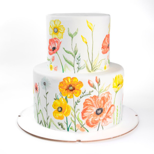 Прикрашений художніми елементами, створеними безпосередньо на поверхні торта.