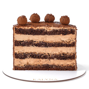 Детальніше: Яйця, цукор, борошно пшеничне, крохмаль картопляний, молоко , вершки тваринні, масло вершкове 82%, цукрова пудра, какао,розпушувач, молоко згущене, фундук, олія, шоколад молочний Callebaut,шоколад чорний Callebaut, роялтин