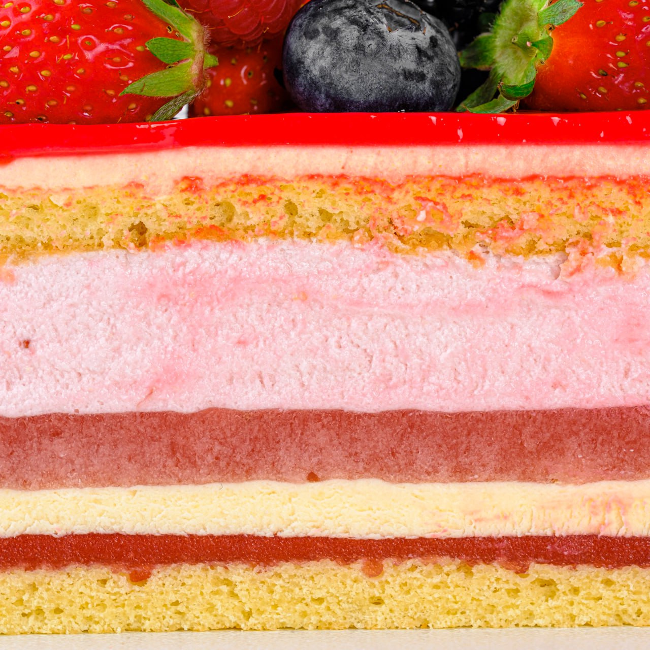 Детальніше: Яйця, цукор, борошно мигдальне, крохмаль ,цукрова пудра ,молоко,вершки 26%, молоко згущене, глюкоза, масло вершкове 82%, шоколад білий 30%, полуниця см, масло какао,ожина, малина, полуниця, лохина