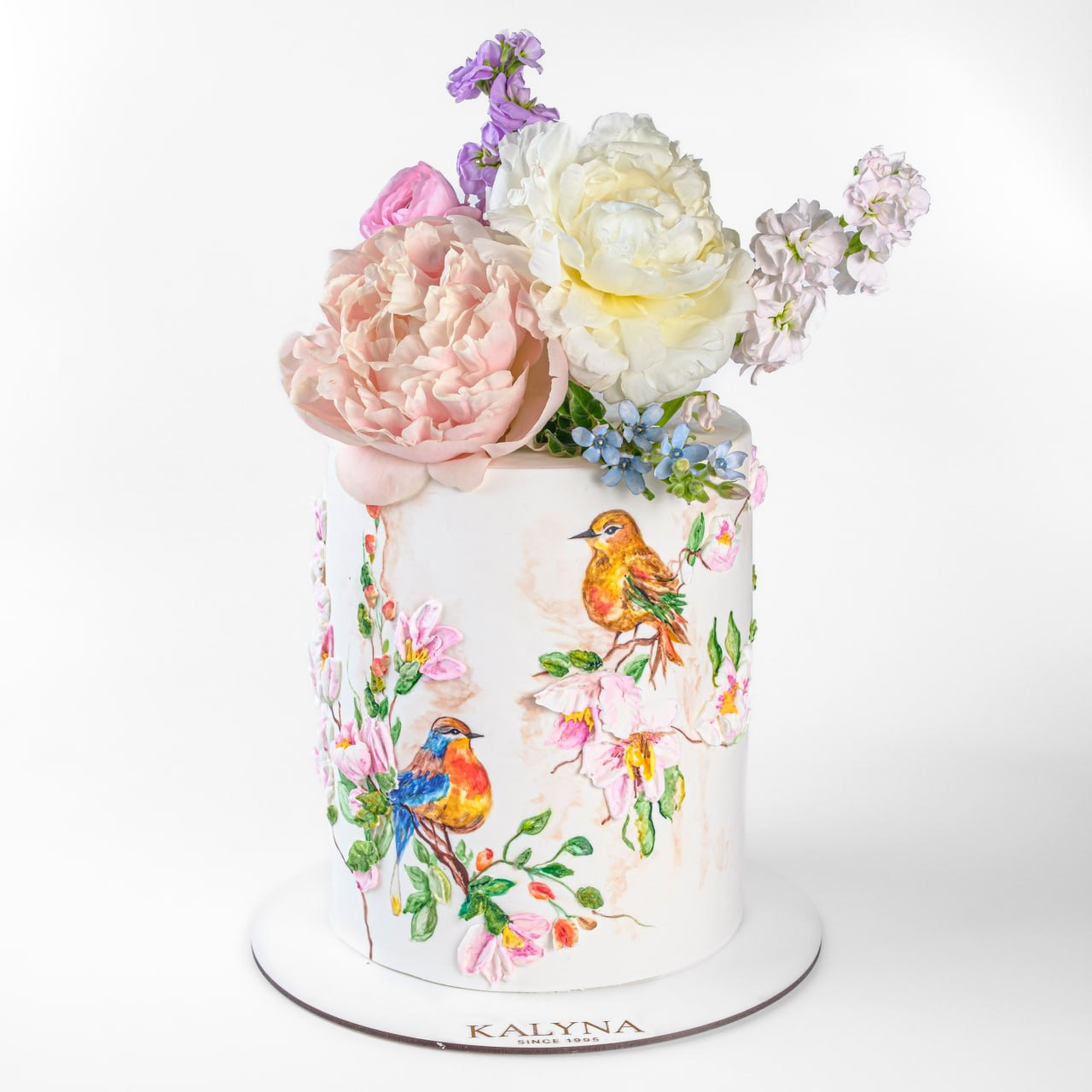 Прикрашений художніми елементами, створеними безпосередньо на поверхні торта і живими квітами