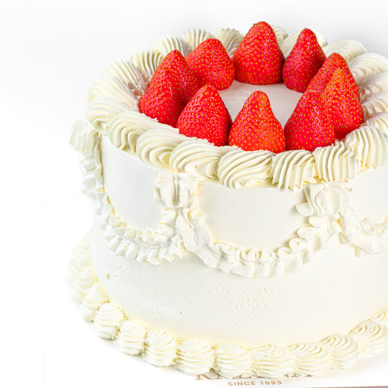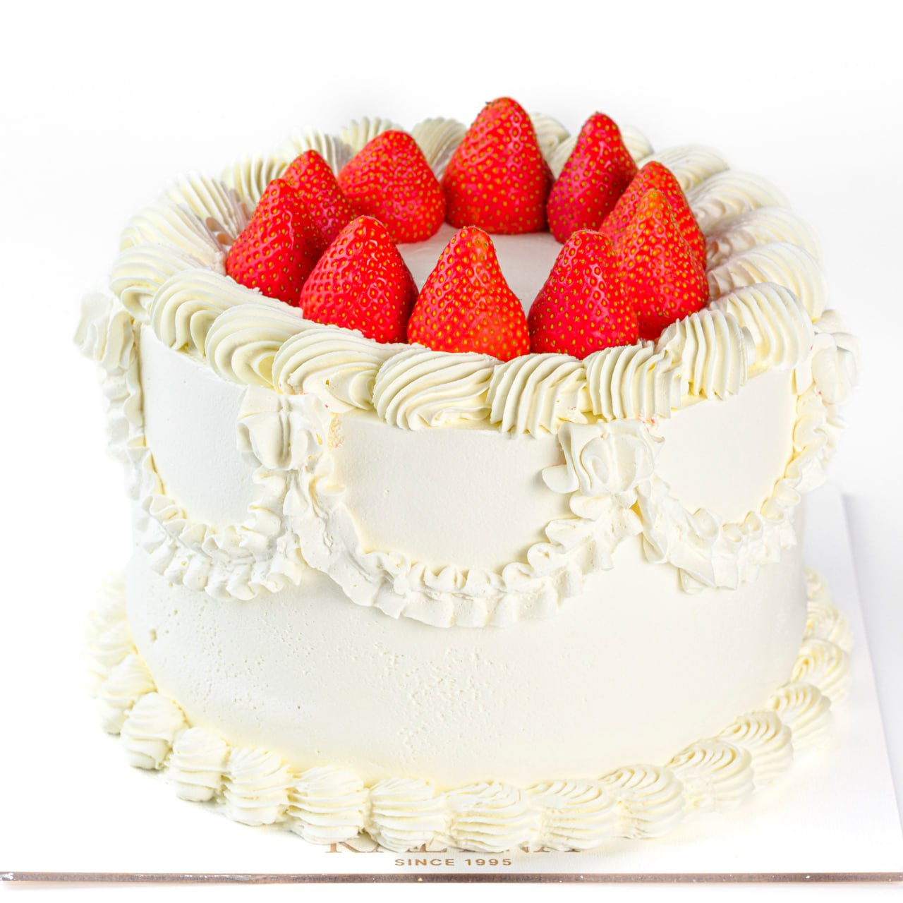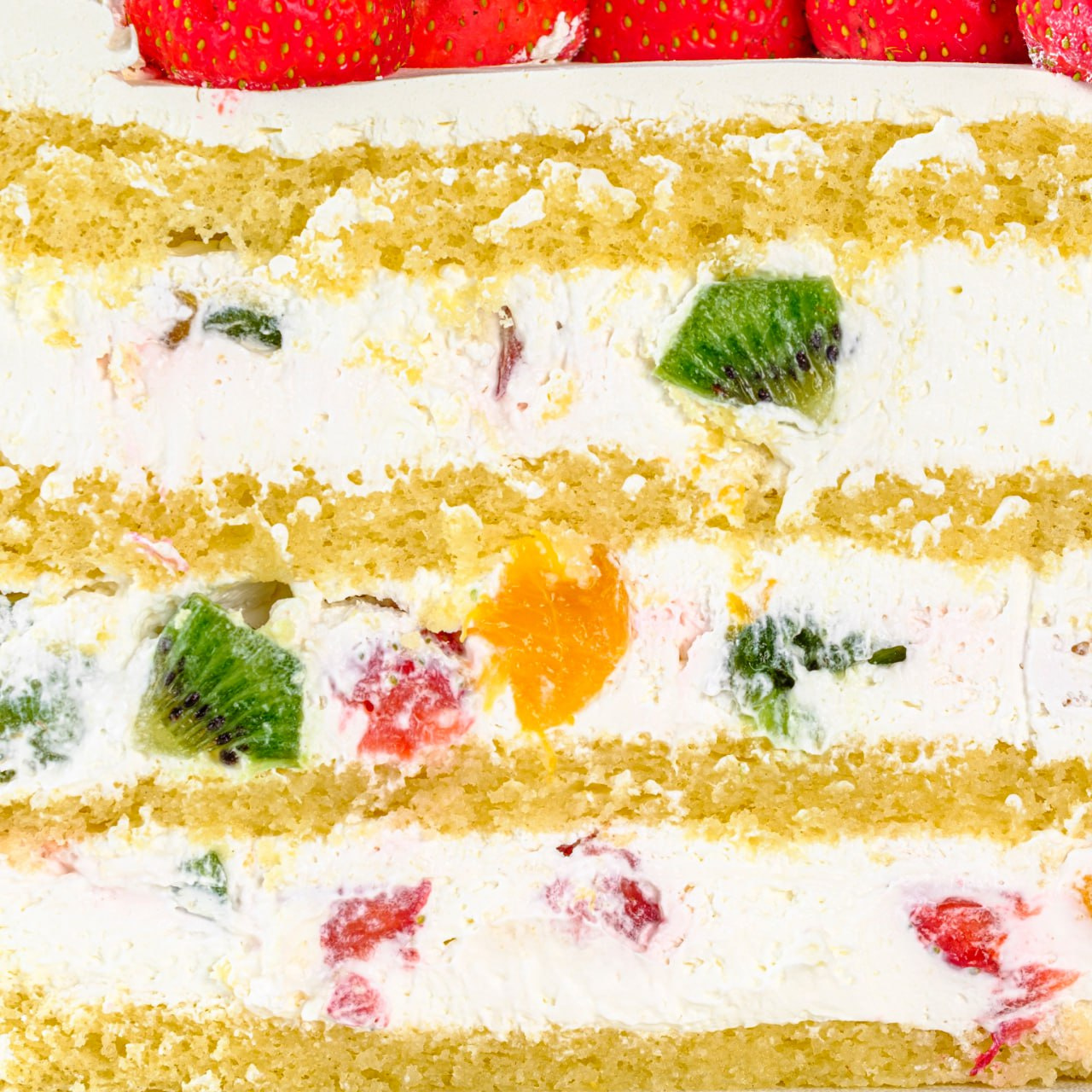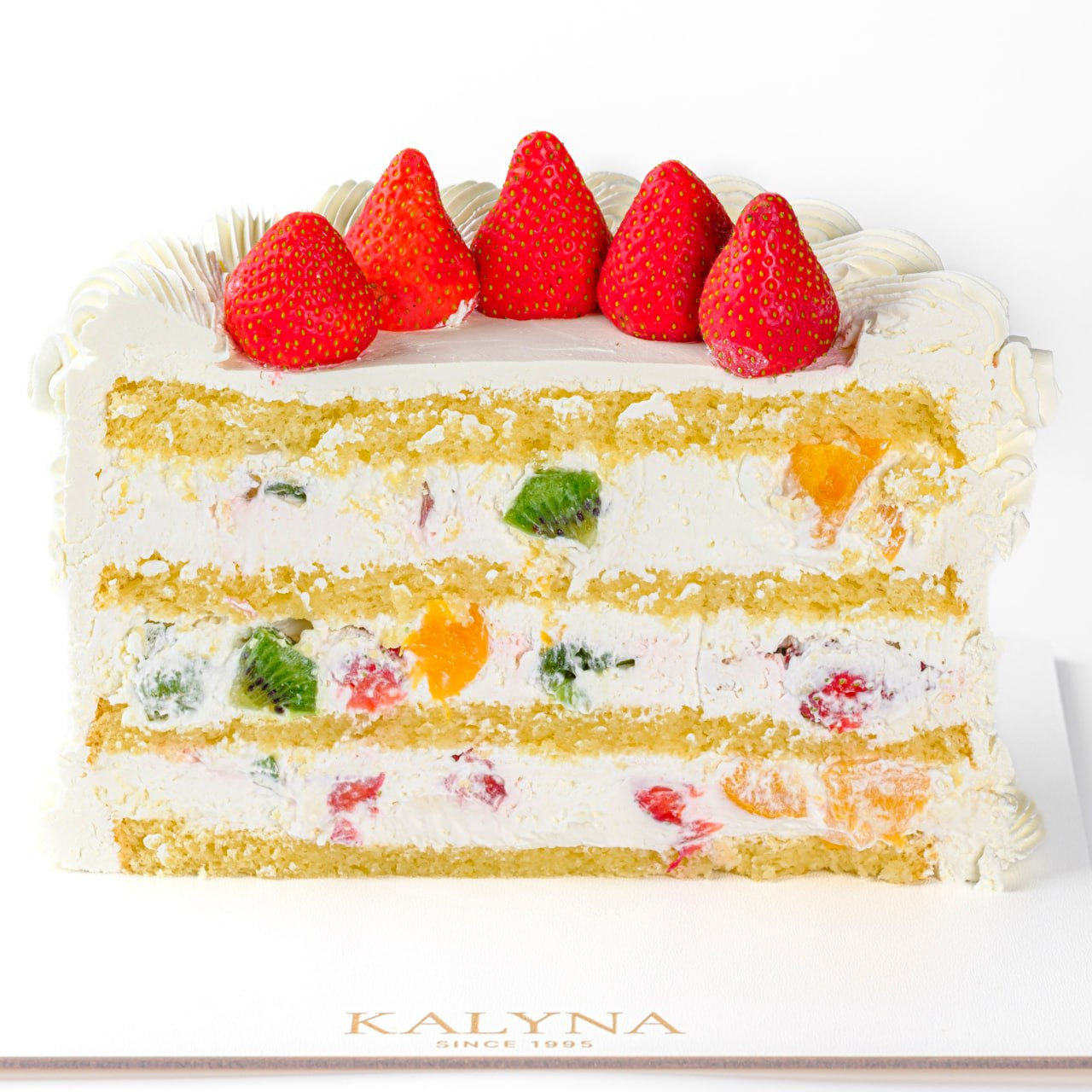 Найніжніший класичний бісквіт, просочений фруктовим сиропом, збиті повітряні вершки, зі шматочками фруктів (асорті: свіжа полуниця, персик, ківі). Вкритий крем чізом, прикрашений свіжою полуницею.