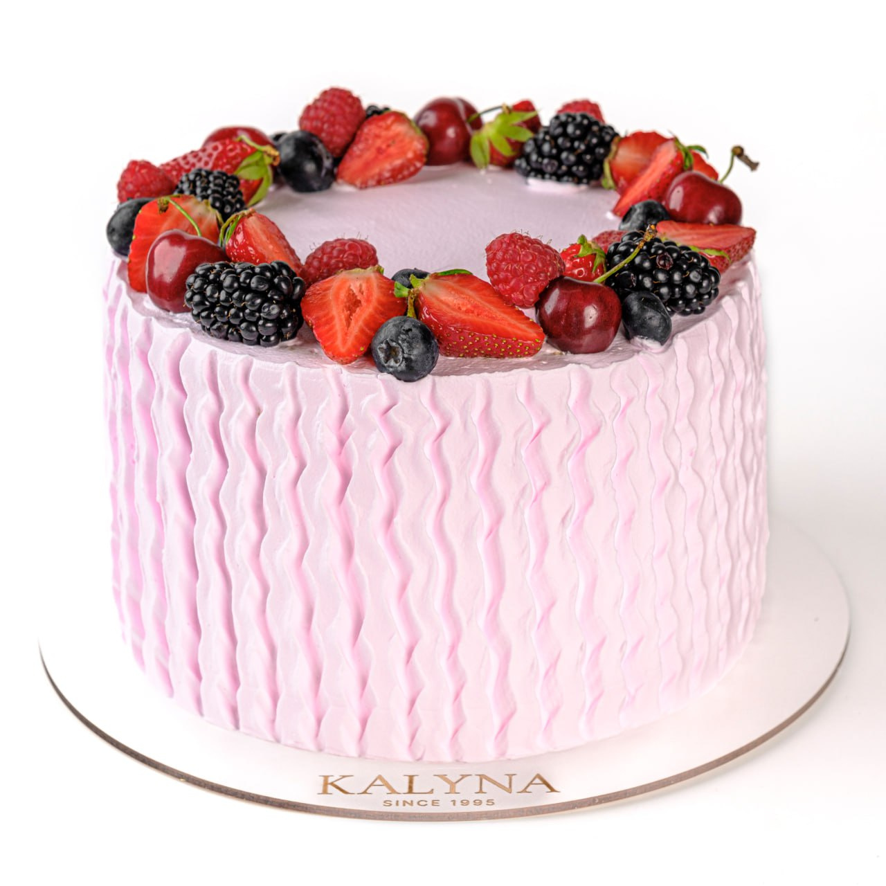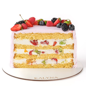 Ванільний бісквіт на безглютеновому борошні, безлактозні вершки, зі шматочками фруктів: свіжа полуниця, персик, ківі. Оформлений торт свіжими ягодами полуниці,ожини, лохини,малини.